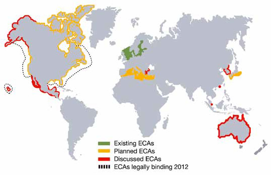 В зонах контроля выбросов, портах Европейского союза (ЕС) и в Калифорнии также вступят в силу более строгие нормативы, касающиеся содержания серы в топливе. Например, в ЗКВ содержание серы должно быть сокращено с сегодняшнего 1.0% до 0.1% к 2015 году.